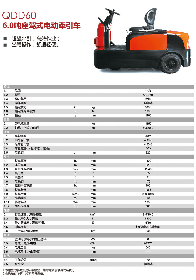 中力電動叉車,6.0噸座駕式電動牽引車QDD60